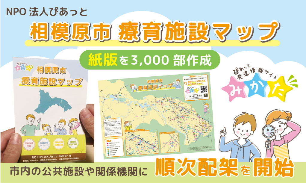 NPO法人ぴあっとでは、相模原市内の療育施設や福祉サービスを一覧で確認できる「相模原市療育施設マップ・紙版」を作成しました。 本マップは3,000部を作成し、現在、相模原市内の療育施設や関係機関で順次配架を開始しています。 【Webだけでは届きにくい… -