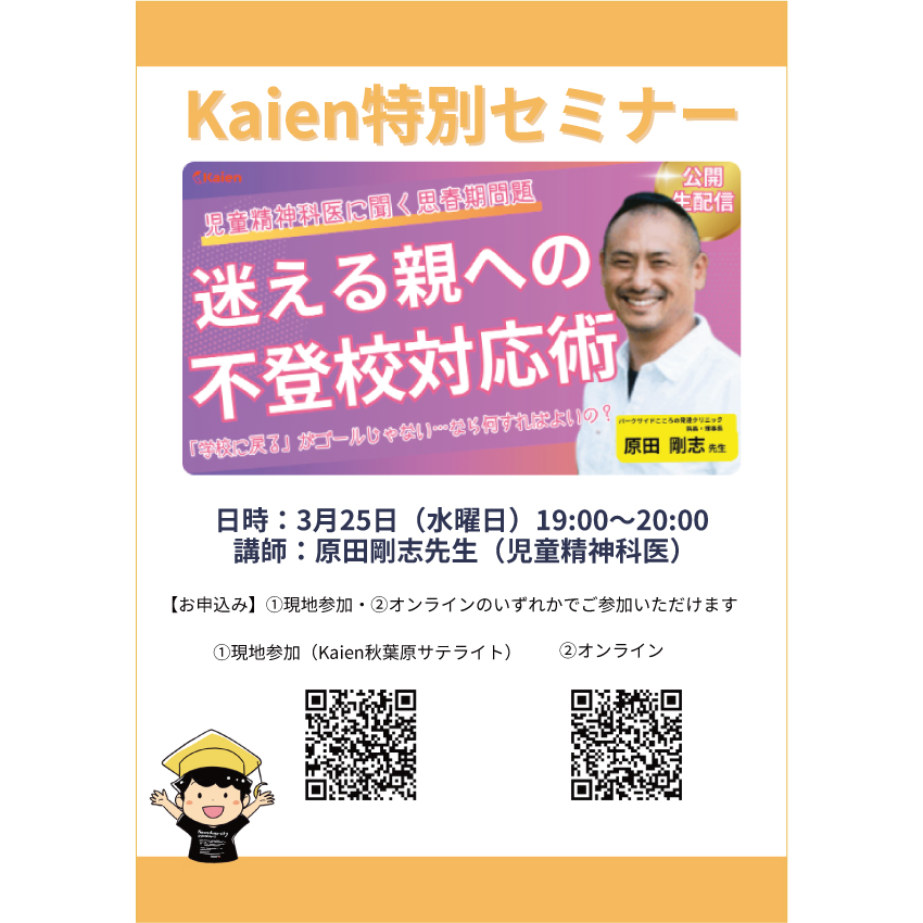 児童精神科医 原田剛志先生(パークサイドこころの発達クリニック院長) をお招きし、思春期・不登校支援をテーマにした特別セミナーを開催することとなりました。