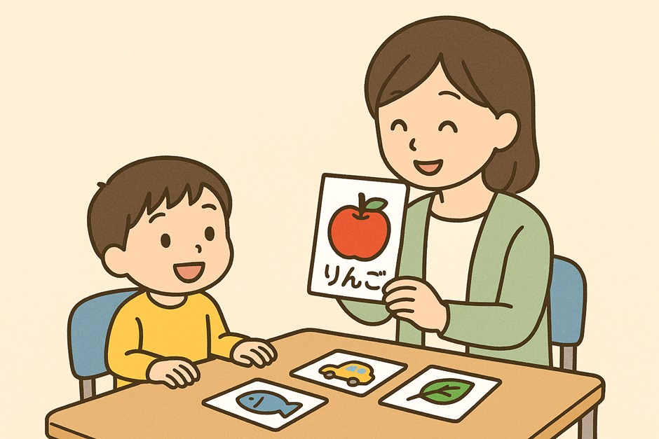 ● 絵カードを使って、「これなぁに?」「り・ん・ご」と、言葉の表出や認知を広げる遊び