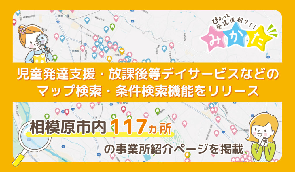 ぴあっと発達情報サイトみかた内に相模原市内の児童発達支援・放課後等デイサービス・保育所等訪問支援・障害児相談支援をマップ検索・条件検索で探せる機能をリリース… -